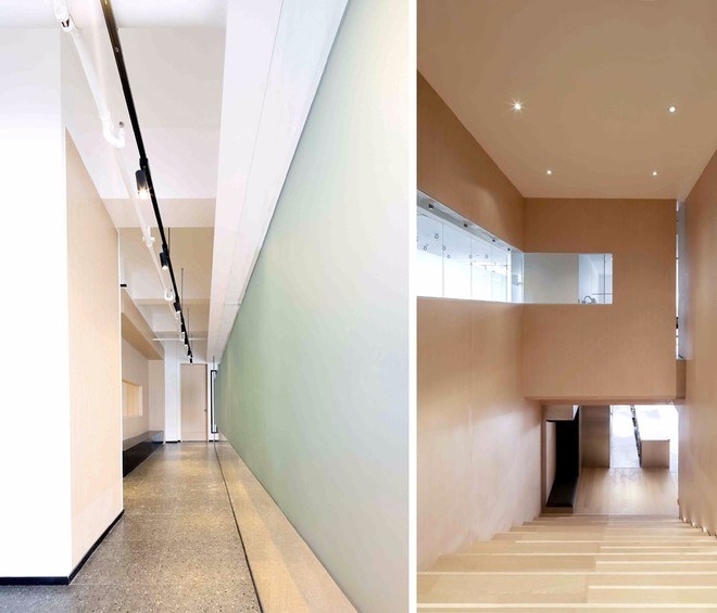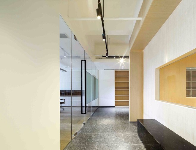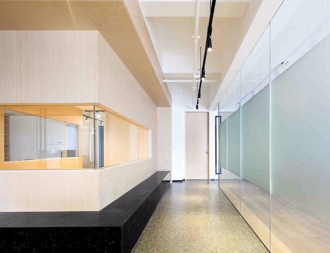 拾級而上,繁轉(zhuǎn)至簡,木階梯暈染開的光線引入二層教育辦公空間白凈素雅,方正通透一曲將歇,音符緩緩?fù)V褂谠贫恕?霧面玻璃,淺白木質(zhì),黑色石材如墨,緩緩壓下最后一筆。
