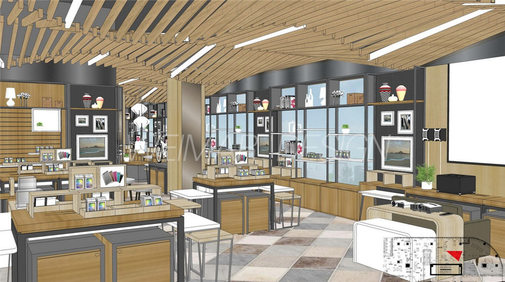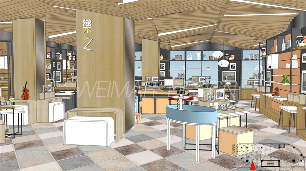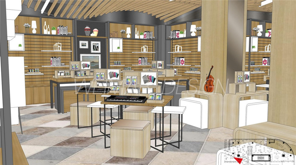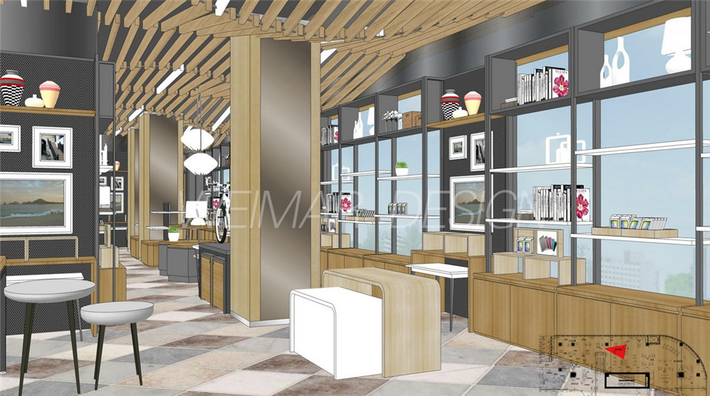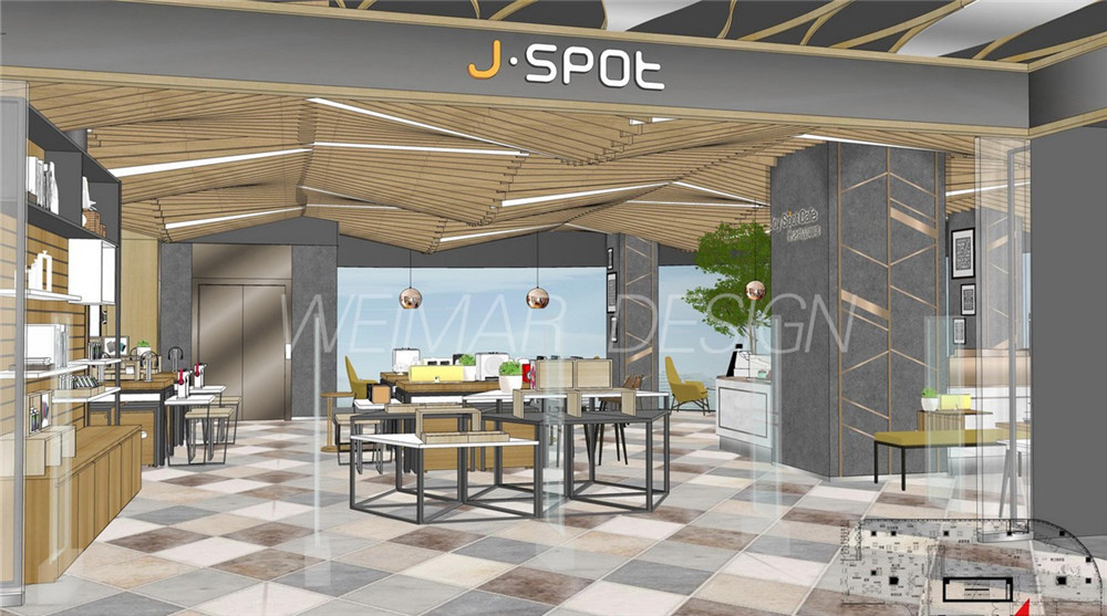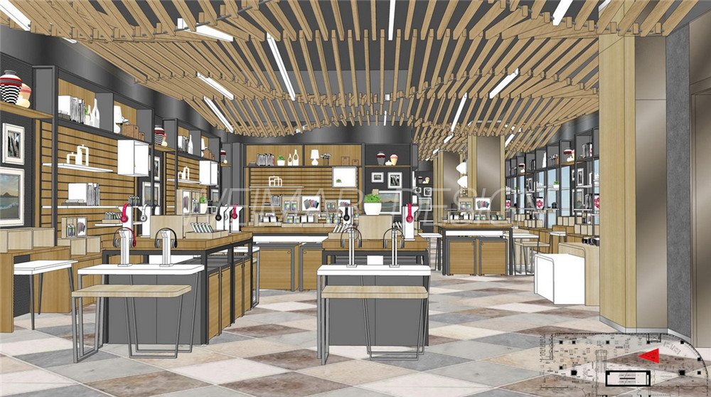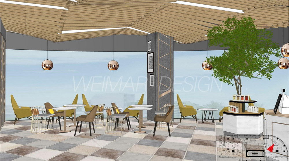 本方案是以音樂的旋律感為設計主題,整個咖啡廳設計中運用了波浪形的線形來體現(xiàn)旋律感,大堂吊頂用大面積的波浪形木條做造型,蜿蜒起伏,既有旋律感也略帶有一絲動感。