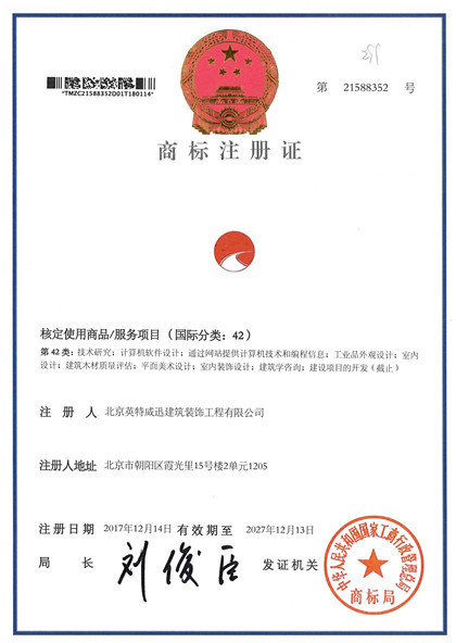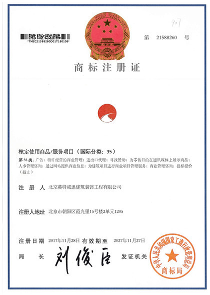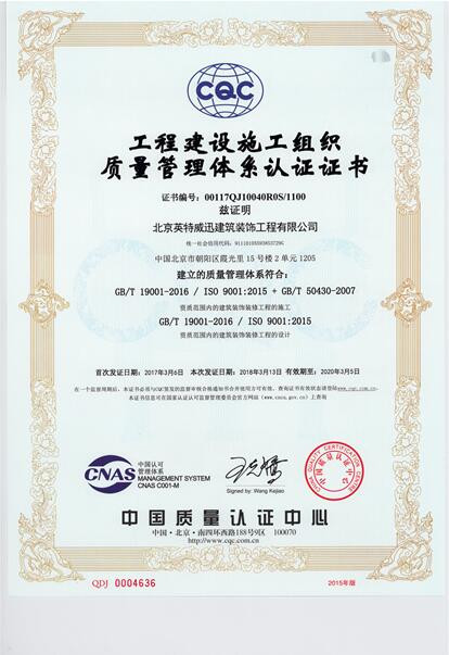 茲證明北京英特威迅建筑裝飾工程有限公司建立的質(zhì)量管理體系符合資質(zhì)范圍內(nèi)的建筑裝飾裝修工程的施工和資質(zhì)范圍內(nèi)的建筑裝飾裝修工程的設(shè)計(jì)。