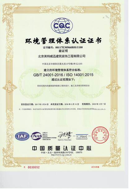 茲證明北京英特威迅建筑裝飾工程有限公司建立的環(huán)境管理體系符合標(biāo)準(zhǔn),通過認(rèn)證范圍如下:資質(zhì)范圍內(nèi)的建筑裝飾工程的設(shè)計(jì)、施工及其相關(guān)管理活動。