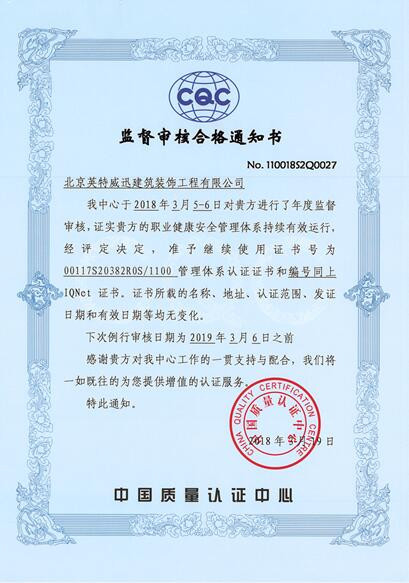 北京英特威迅建筑工程有限公司,我中心于2018年3月5-6日對貴方進(jìn)行了年度監(jiān)督審核,證實(shí)貴方的職業(yè)健康安全管理體系持續(xù)有效運(yùn)行。