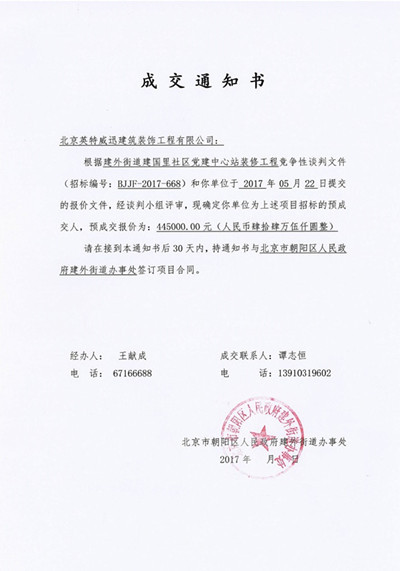 根據(jù)建外街道建國(guó)里社區(qū)黨建中心站裝修工程競(jìng)爭(zhēng)性談判文件(招標(biāo)編號(hào):BJJF—2017—668)和英特威迅于2017年5月22日提交的報(bào)價(jià)文件,經(jīng)談判小組評(píng)審,現(xiàn)確定英特威迅為上述項(xiàng)目招標(biāo)的預(yù)成交人,預(yù)成交報(bào)價(jià)為445000.00元(人民幣肆十肆萬(wàn)伍千圓整)。